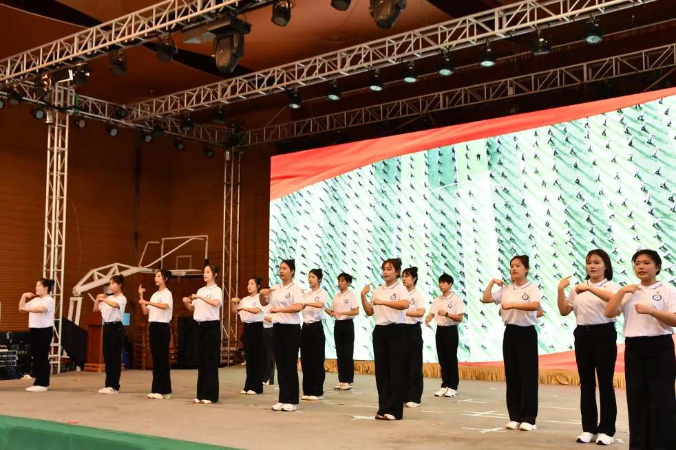 决赛现场氛围庄严温馨,在全体与会人员共同演绎的手语版《国歌》中拉开序幕。来自10所高校的15支代表队依次登台,我校代表队以手语演绎《走向复兴》,背景视频与规范动作相呼应,让无声的手势既承载歌曲昂扬基调,又传递民族复兴情怀。学子们全情投入,从手势幅度控制到眼神情感交流,每处细节都彰显对残障群体的尊重与对比赛的重视,生动诠释“平等、包容、关爱”的助残理念。