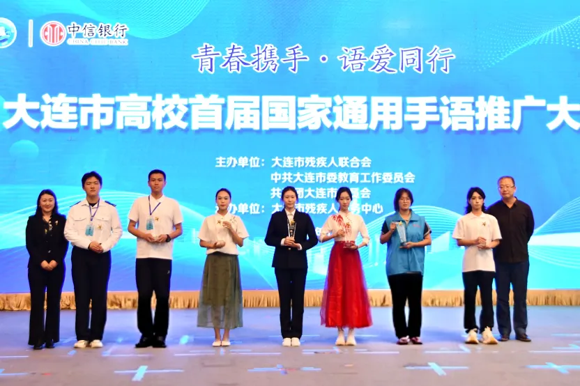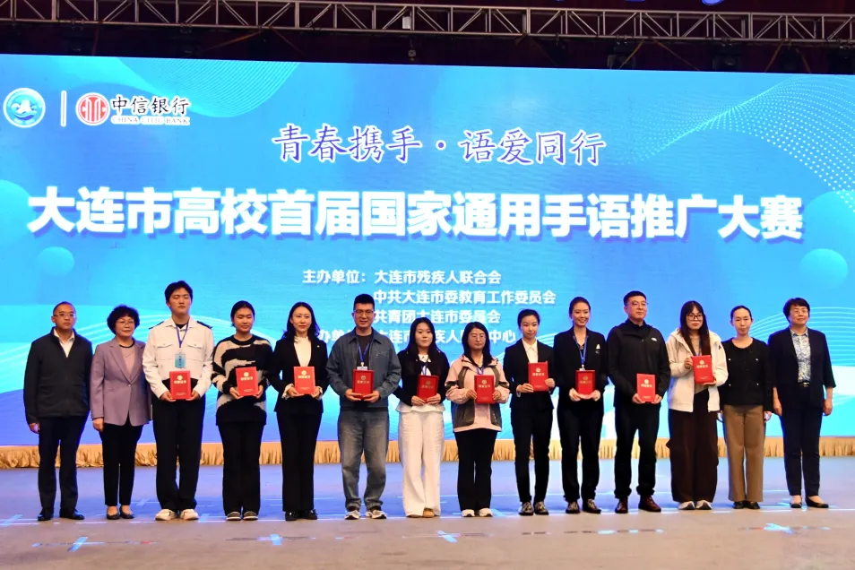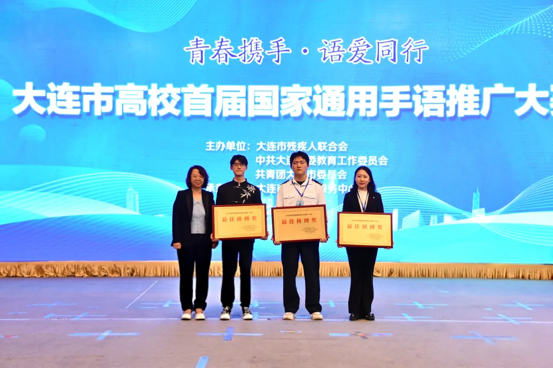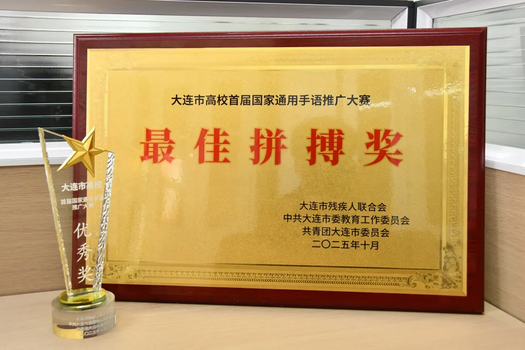 本次大赛特邀专家从手语规范性、情感传递、音乐表现力等多维度综合评分。经激烈角逐,我校代表队凭借出色表现,在15支决赛队伍中斩获最佳拼搏奖、优秀奖;与此同时,我校梅傲雪老师被授予“大连市手语推广员”称号。此次成绩的取得,不仅展现了我校学子的专业素养与责任担当,更彰显了学校在手语推广与残健融合工作中的积极作为。